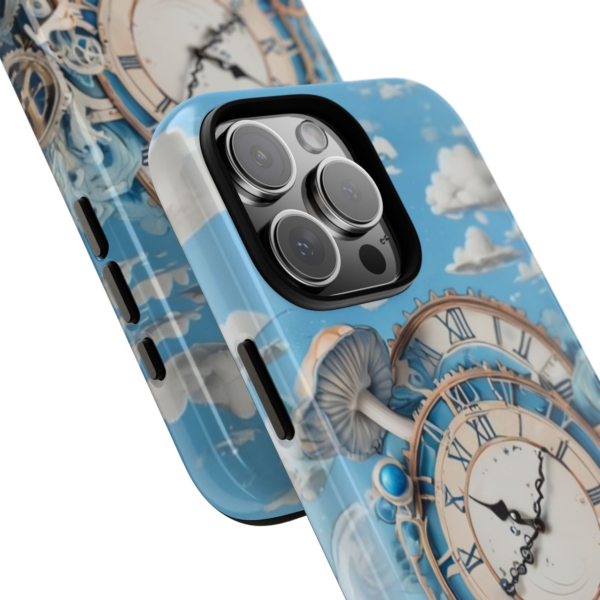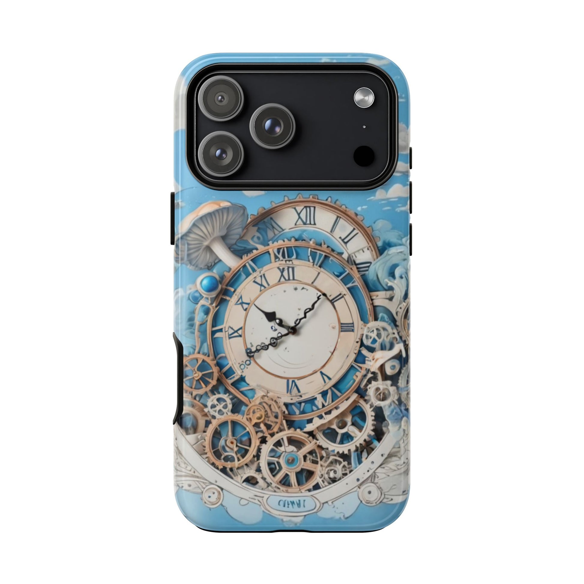 A dreamy phone case featuring a giant vintage clock surrounded by gears, clouds, and mushrooms, set against a soft blue background with whimsical steampunk elements. Perfect for adults who love steampunk aesthetics and want to protect their phones in style. Ideal for occasions such as birthdays, holidays, or as a thoughtful gift for tech-savvy friends.
